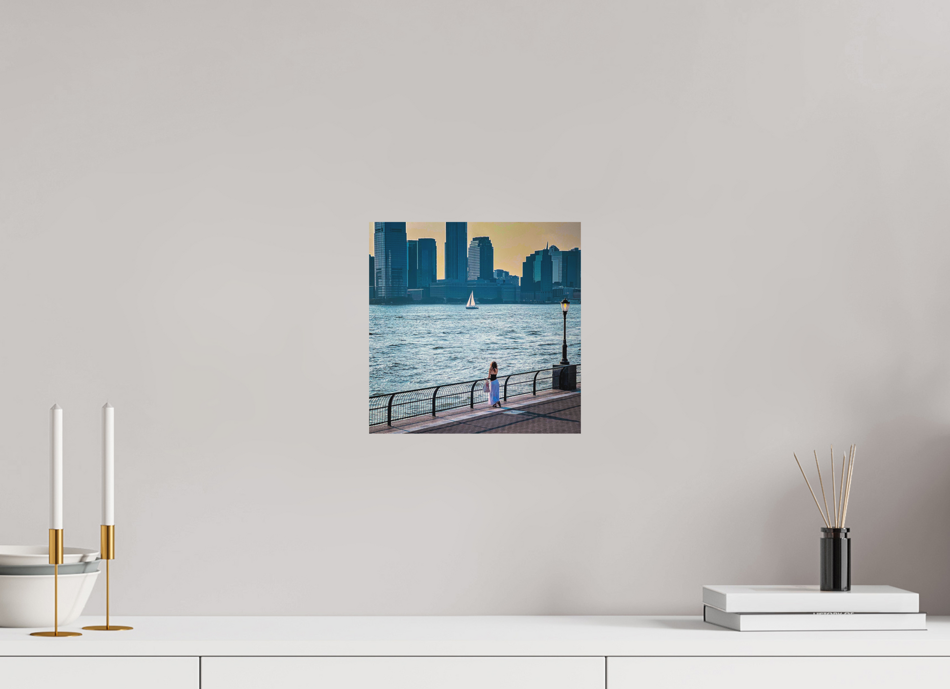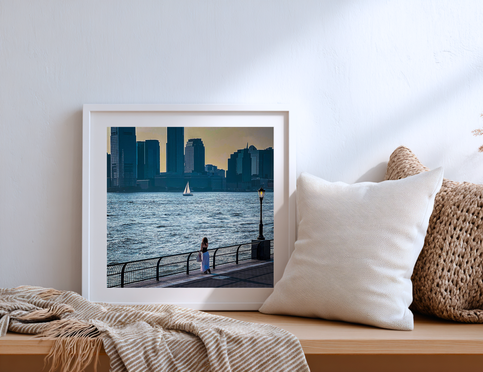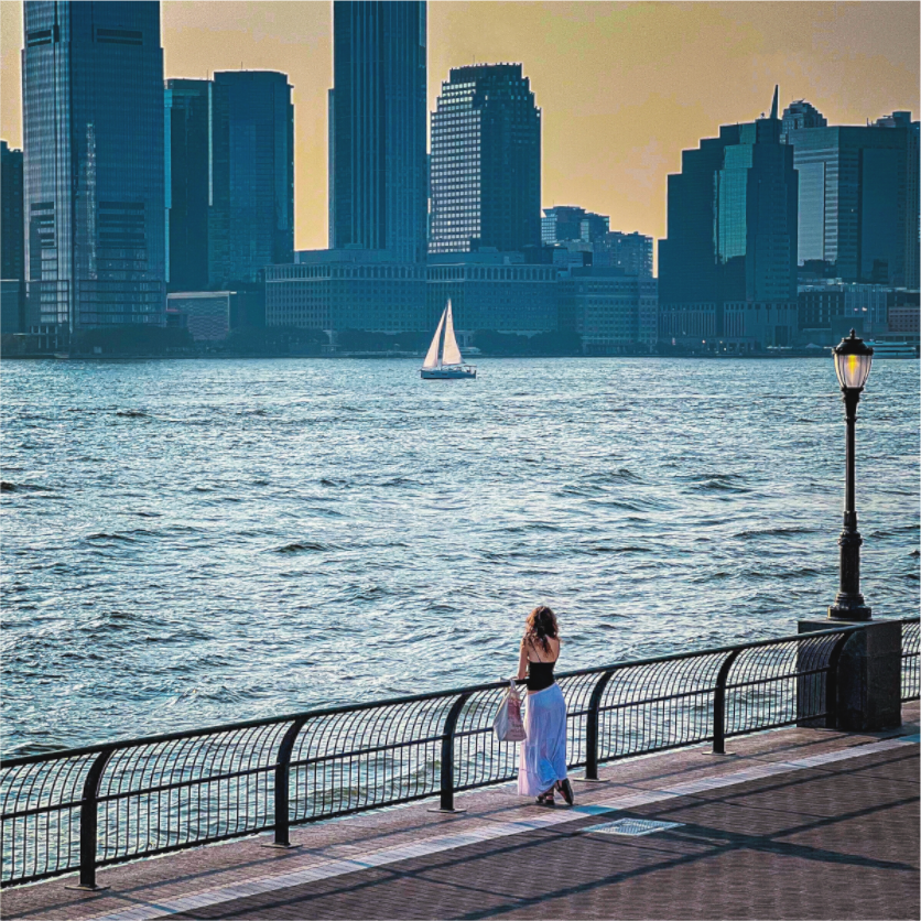 Fine Art photographic print of a woman standing by the Hudson River in NYC at sunset hour.